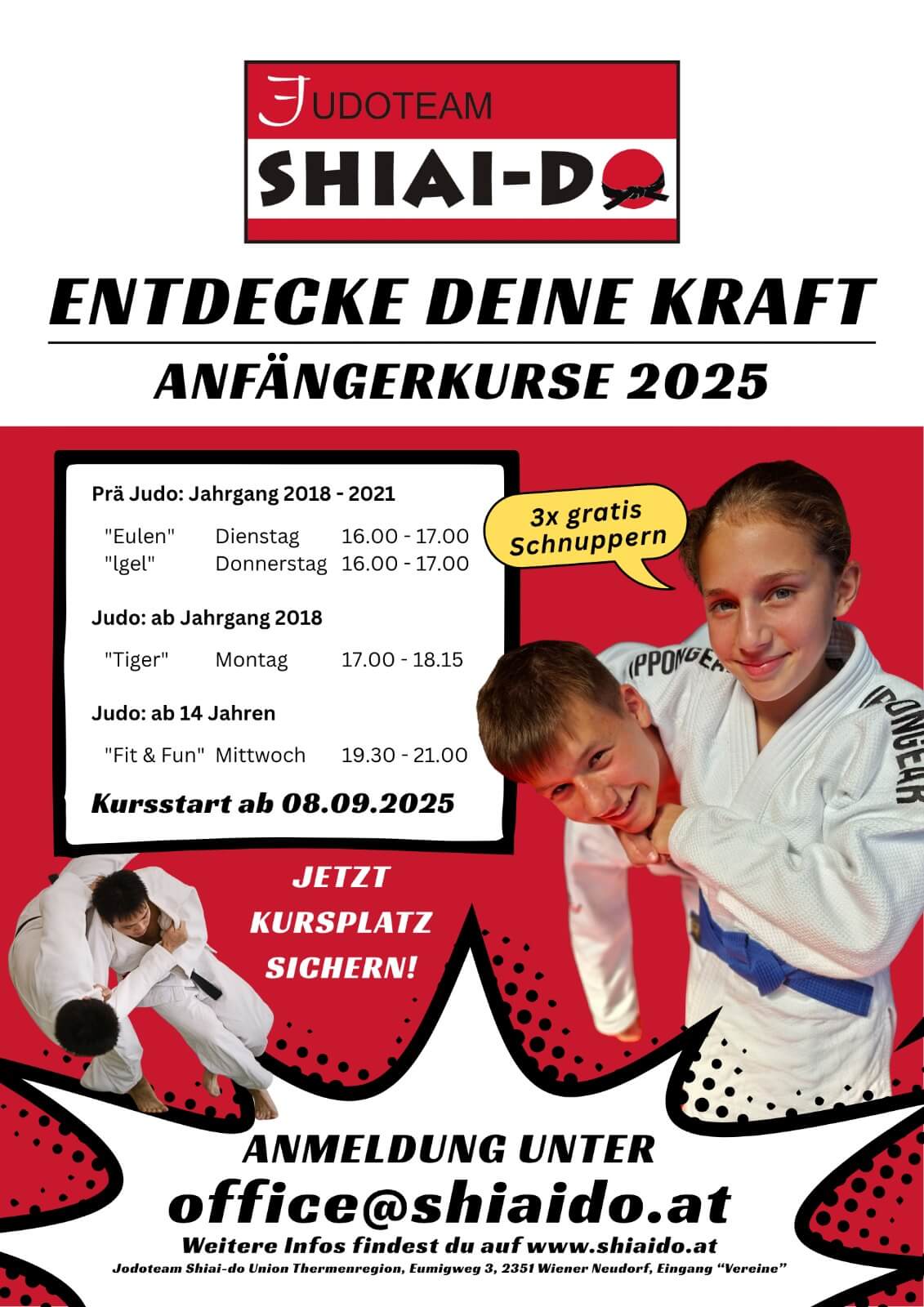 Beim Judoteam SHIAI-DO in Wiener Neudorf bist du genau richtig. Unser Verein bietet seit vielen Jahren professionelles Judo Training für Kinder, Jugendliche und Erwachsene – von den ersten Schritten bis hin zum leistungsorientierten Sport.